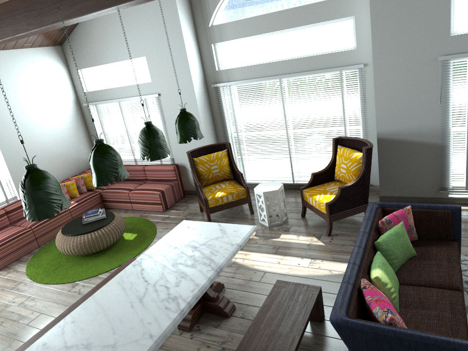 Stylized furniture icons including sofa, chair, lamp, and decor elements, representing modern interior design concepts in Miami.